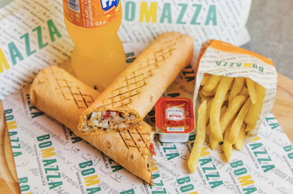 Комбо Сырный: лаваш, курица, помидор, огурец, свежий салат из капусты, два вида фирменного соуса (чесночный, томатный), картофель фри и напиток на выбор